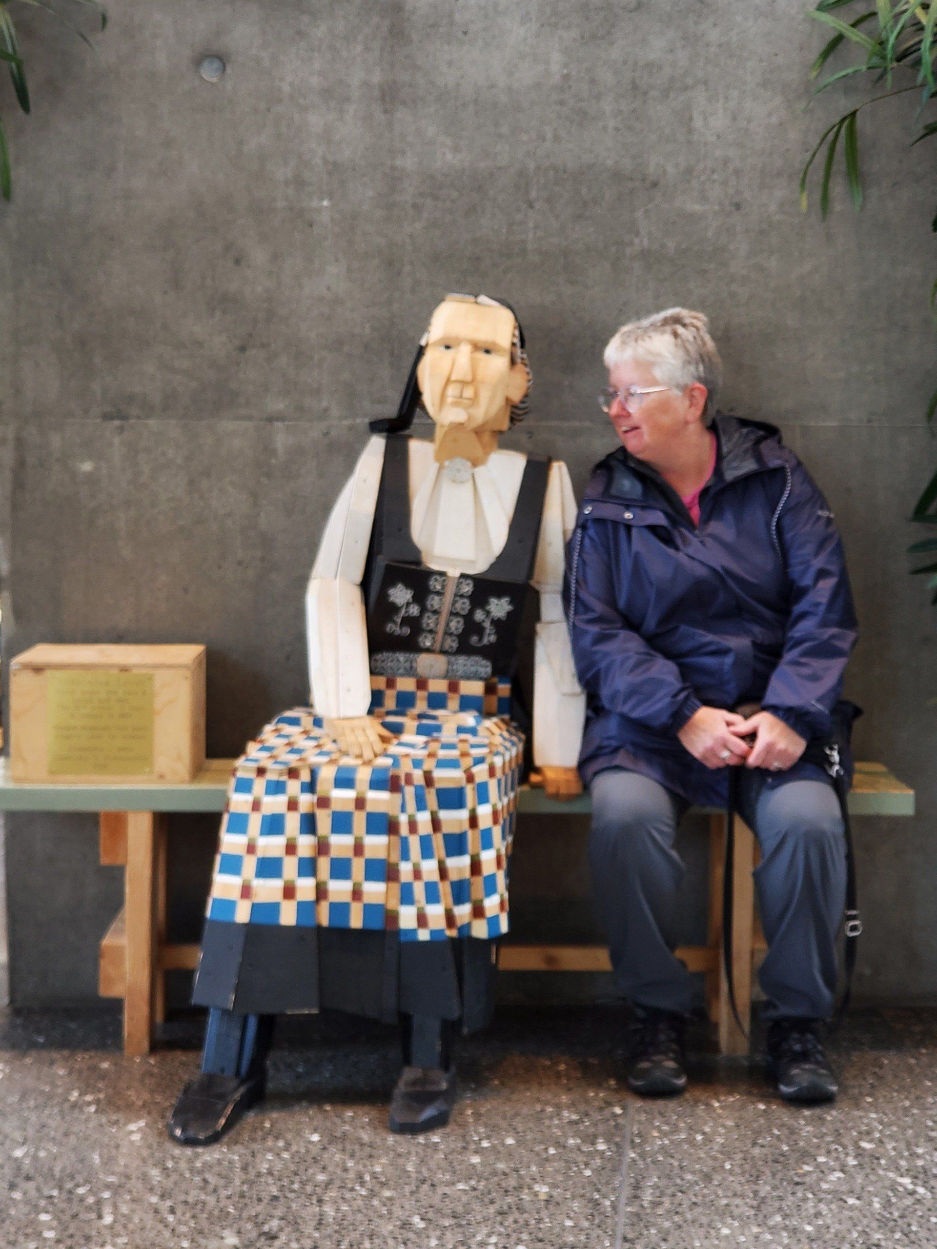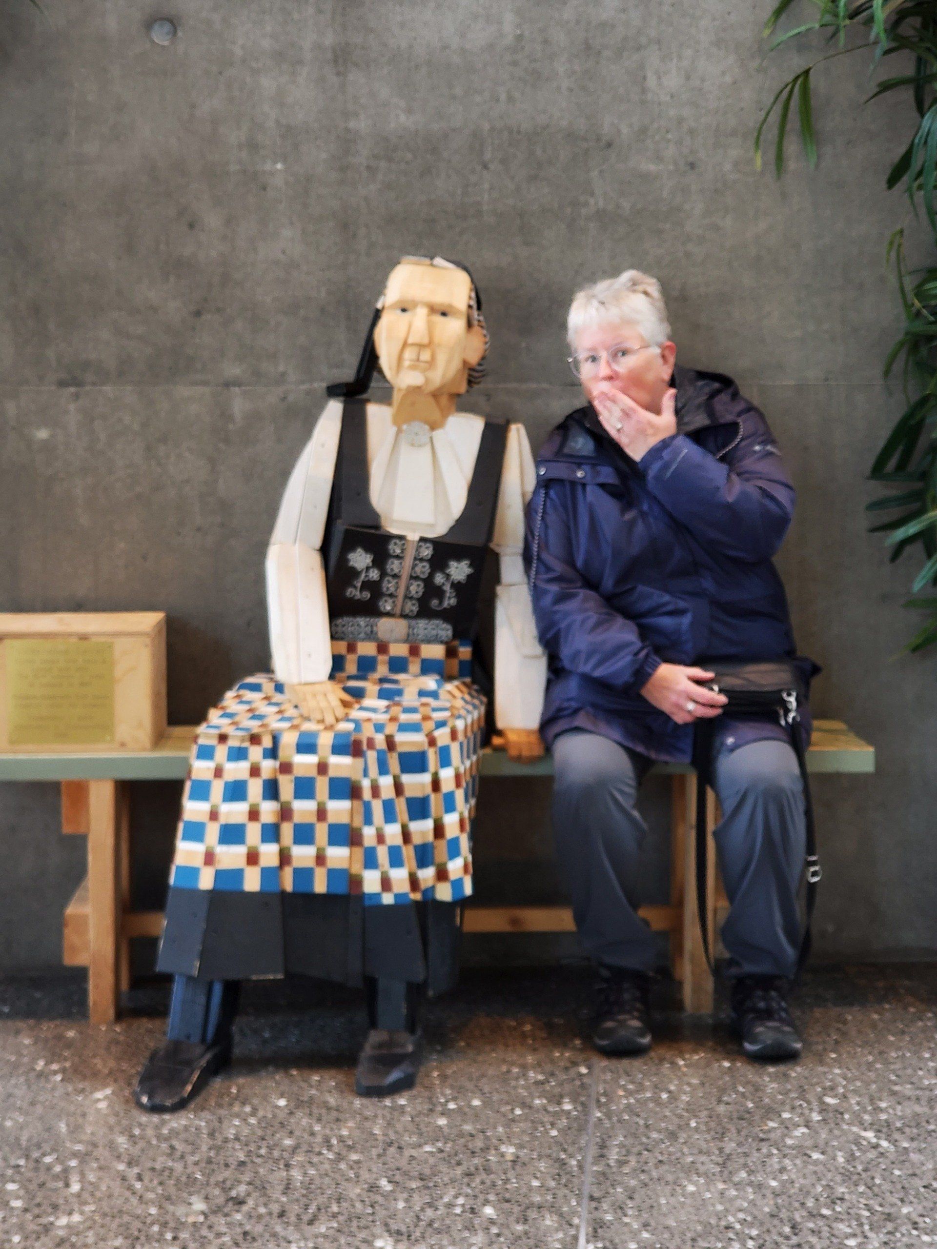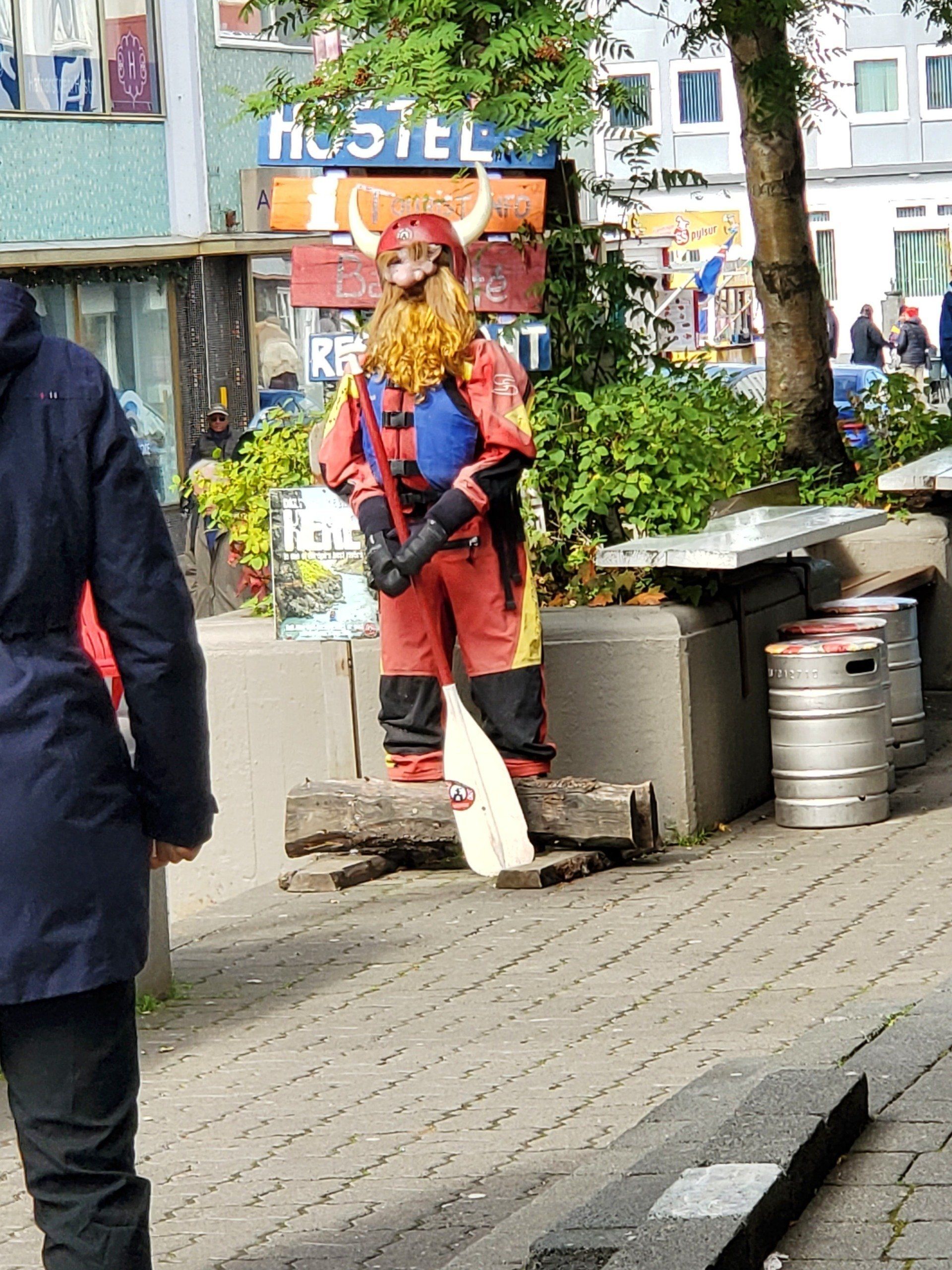 Then a bit of goofing around downtown. Trolls, elves and witches are part of the Icelandic folklore. On the street was this fun troll and Gerry and Larry enjoyed. The Norseman was fun too. We also went to the performance center and met the old lady on the bench.